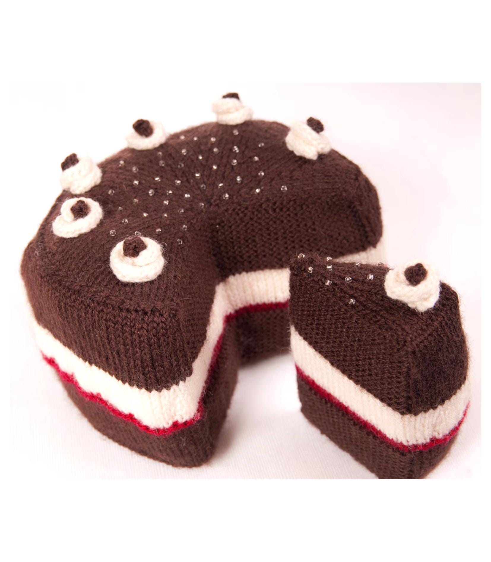 The main cake is worked in 3 main pieces with only one seam to sew at the end. Part of it is worked in the round on double pins. For both the cake and the slice, cardboard is used to give a firm shape. A template is included. Finished cake measures 10 cm high and 16 cm diameter.